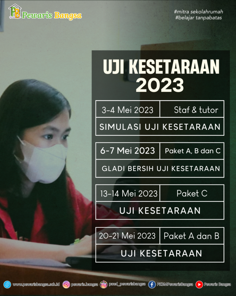 Ujian paket C akan dilaksanakan pada tanggal 13 dan 14 Mei 2023, sedangkan ujian paket A dan B akan dilaksanakan pada tanggal 20 dan 21 Mei 2023. Dalam ujian kesetaraan ini, peserta akan diuji dalam literasi dan numerasi.
