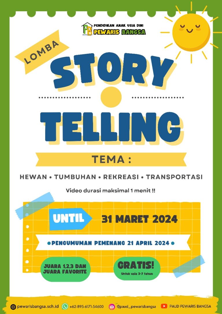 PAUD Pewaris Bangsa menggelar Lomba Storytelling yang sayangnya tak boleh dilewatkan! π Dengan 4 tema menarik yang bisa adik-adik pilih sesuai keinginan: