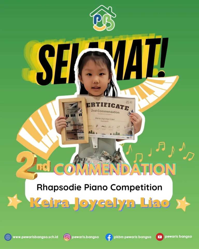 Keluarga besar PKBM Pewaris Bangsa dengan bangga mengucapkan selamat kepada Keira Joycelyn Liao atas pencapaiannya yang luar biasa dalam ajang Rhapsodie Piano Competition! Keira berhasil meraih penghargaan 2nd Commendation, sebuah prestasi yang membanggakan dan menginspirasi. 🎹🏅✨