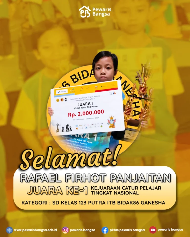 Keluarga besar PKBM Pewaris Bangsa mengucapkan selamat kepada Rafael Firhot Panjaitan, siswa kelas 3 SD, atas pencapaiannya meraih Juara 1 dalam Kejuaraan Catur Pelajar Tingkat Nasional kategori SD Kelas 1-3 Putra. Ajang ini diselenggarakan oleh ITB Bidak86 Ganesha pada tanggal 1 September 2024.