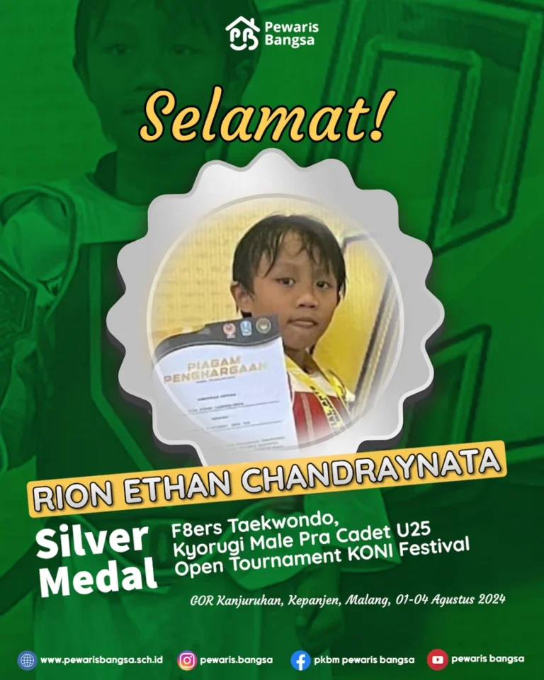 Keluarga besar PKBM Pewaris Bangsa dengan bangga mengucapkan selamat kepada Rion Ethan Chandraynata atas pencapaiannya yang luar biasa. Rion, yang juga merupakan anggota F8ers Taekwondo, berhasil meraih Silver Medal dalam ajang Open Tournament KONI Festival – East Java 2024 pada kategori Kyorugi Male Pra Cadet U25.